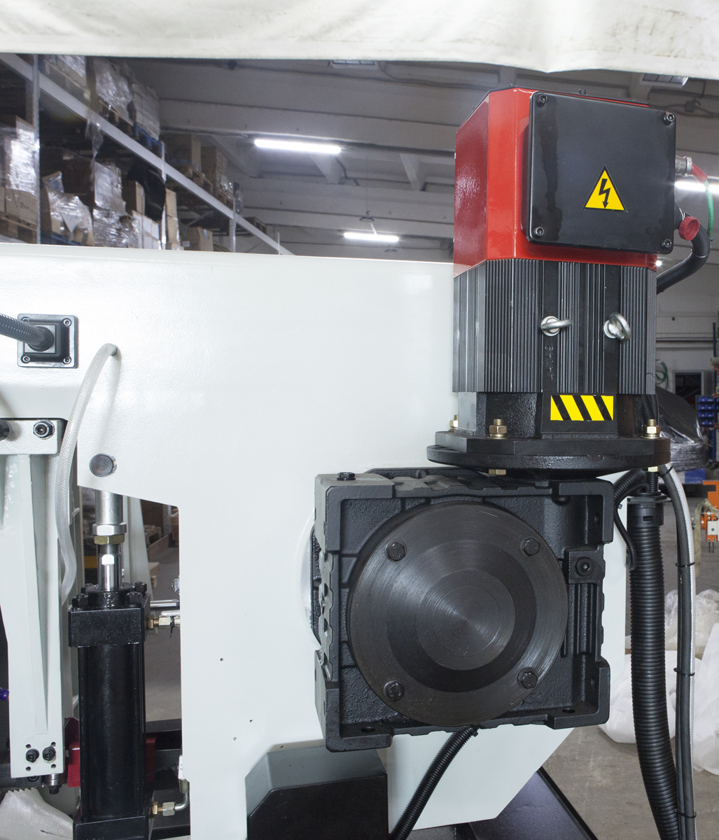 Автоматический ленточнопильный станок, предназначен для пиления труб максимальным диаметром 460 мм и прямоугольной профильной заготовки 650x350 мм под углом 90°. На автоматических станках возможна работа как в ручном режиме, когда каждая операция выполняется вручную посредством нажатия соответствующей кнопки, так и в автоматическом режиме, когда станок выполняет весь цикл резания (зажим заготовки – подвод заготовки – запуск пилы – опускание рамы – остановка пилы – подъем рамы – отжим тисков). В последнем случае оператор должен лишь обеспечить подачу заготовок, предварительно настроив шкалу на дисплее необходимой длины получаемых заготовок и запустить цикл пиления кнопкой «Пуск». В стандартную комплектацию входят: - Ленточнопильный станок - Ленточнопильное полотно, установленное на станке - Сенсорный экран управления на поворотной панели - Гидравлические зажимные тиски - Автоматический зажим и подача материала в зону резания, гидравлический привод с PLC контроллером - Гидроцилиндр подъёма пильной рамы - Регулировка подачи пильной рамы - Лампа дополнительного освещения - Механическое натяжение полотна - Серводвигатель для плавной регулировки скорость вращения полотна 23-95 м/мин - Система охлаждения режущего инструмента и заготовки - Дисковая щётка для очистки полотна от стружки, приводимая в движение от движения шкива - Прижимы для пакетной резки – на стационарные и подающие тиски Основные элементы - Угол пиления заготовок 90°; 15°; 30°; 45°; 60°. - Поворот рамы происходит на угол кратный 1°, поворот производится автоматически от ЧПУ станка и выводится на дисплей. Рама станка поворачивается за счёт жёсткого поворотного механизма. - Опускание и подъем рамы осуществляется за счет гидравлики автоматически. - Длина подачи заготовки контролируется автоматически c ЧПУ (СNC), движение происходит по линейным направляющим гарантирующим точность подачи. - ЧПУ станка строится на PLC контроллере, ориентированном на работу в промышленном производстве (через развитый ввод сигналов датчиков и вывод сигналов на исполнительные механизмы). - Макс. единичный ход подающих гидравлических тисков – 650мм - Станок управляется трёхфазным двигателем. - Станок оснащён серводвигателем для плавной регулировки скорость вращения полотна 23-95 м/мин. - Предохранительные концевики на кожухе маховика, оберегающие станок преждевременного запуска станка. - Точная регулировка полотна позволяет добиться безлюфтового вращения в вертикальной плоскости, за счет конических подшипников и твердосплавных пластин. - Термозащита электродвигателя. - Высота от пола до основания тисков – 900мм. - Система смазки и охлаждения полотна + пистолет для смыва стружки. - Гидравлическая система регулирования усилия резания. - Автоматическое подъём рамы при завершении резки.