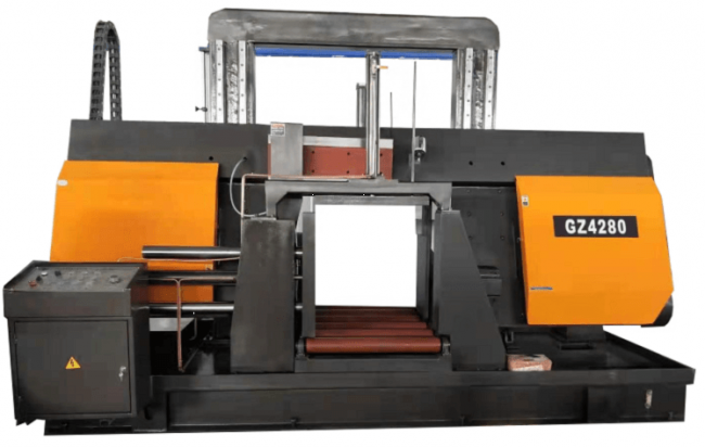 Модель Stalex GZ 4280 является гидравлическим ленточнопильным станком, колонного двухстоечного типа. Полуавтоматический ленточнопильный станок, предназначен для пиления труб и сплошных заготовок, максимальным диаметром круга 800 мм и квадратной заготовки 800x800 мм под углом 90°. Двухстоечные ленточнопильные станки имеют 2 вертикальные стойки (колонны) по которым перемещается горизонтальная пильная рама, образуя жёсткий замкнутый контур с высокой стабильностью реза. Пильная рама, представляет собой стальную сварную конструкцию. На полуавтоматических станках возможна работа как в ручном режиме, когда каждая операция выполняется вручную посредством нажатия соответствующей кнопки, так и в автоматическом режиме, когда станок выполняет весь цикл резания (зажим заготовки – запуск пилы – опускание рамы – остановка пилы – подъем рамы – отжим тисков). В последнем случае оператор должен лишь обеспечить подачу заготовок и нажатие кнопки «Пуск». Основные элементы - Угол пиления заготовок 90°. - Движение рамы – автоматическое - Регулировка движения рамы – гидравлическое бесступенчатое - Точная регулировка полотна позволяет добиться безлюфтового вращения в вертикальной плоскости, за счет блоков с подшипниками и твердосплавных пластин - Регулируемая подача СОЖ в зону резания, смазывающее и охлаждающее полотно - Тиски гидравлические - 15-80 м/мин (плавная регулировка скорости вращения полотна) Пульт станка (модель GZ 4260)