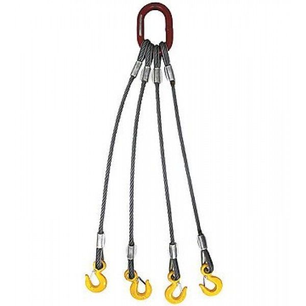 из четырех грузозахватных ветвей, которые соединены общим звеном. Эти изделия изготавливаются двумя способами: путем заплетки концов стального каната или опрессовки концов каната алюминиевой втулкой.
