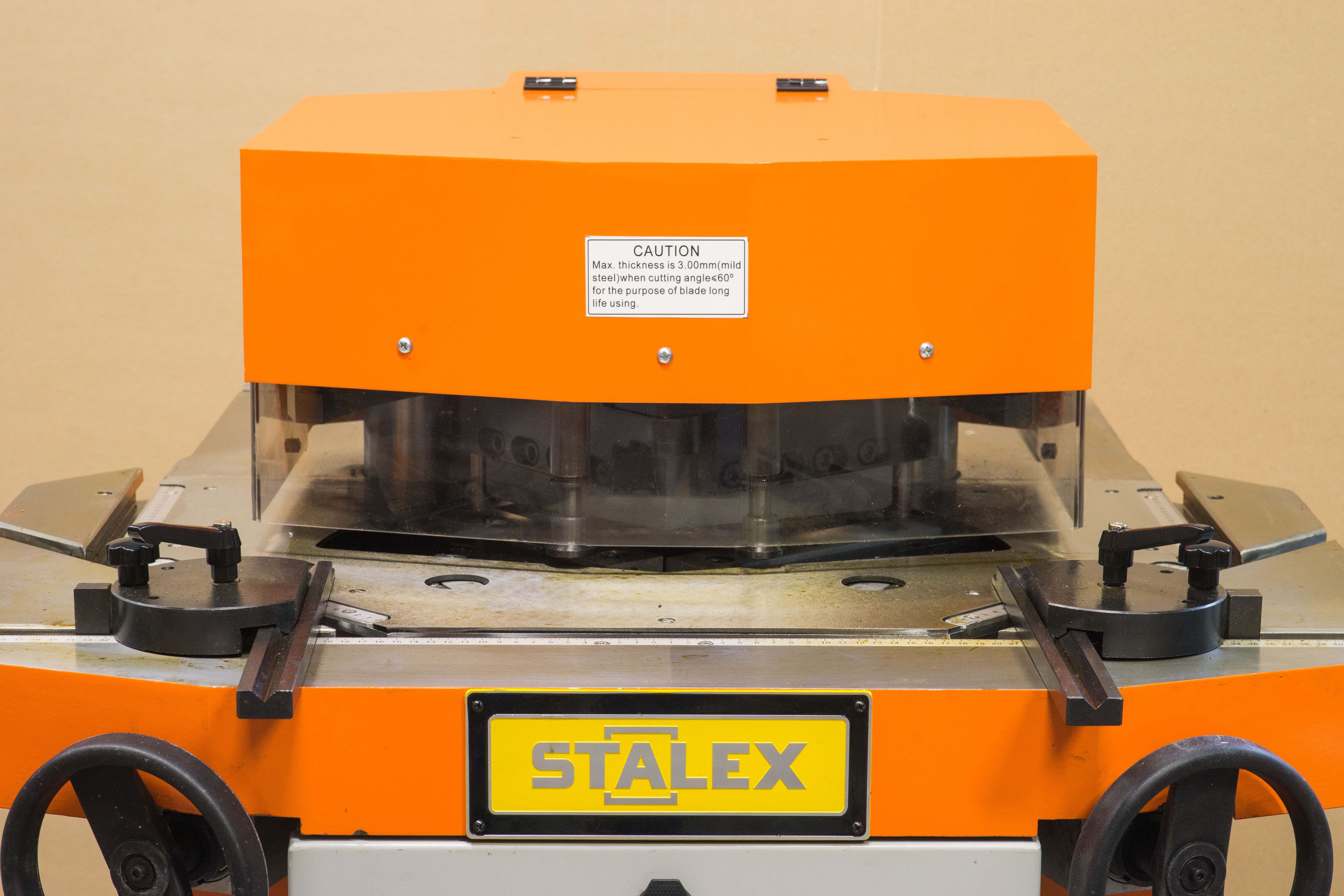 Особенности угловысечного станка Stalex HNM-6A - это мощное оборудование с гидравлическим приводом ножей для вырубки углов от 30° до 140° в листовом металле толщиной до 6 мм. Станок может работать в режиме гильотины и резать листы металла шириной до 200 мм. Процесс резки происходит за счёт работы гидроцилиндра, перемещающего узел по двум направляющим колоннам. Для настройки угла реза и глубины реза в этой модели установлены две шкалы измерения угла резки и две мерные поворотные линейки для обеих сторон. В стандартную комплектацию входит функция пробивки отверстий – Ø 12мм (в зависимости от поставки, возможна комплектация пуансона других диаметров), так же возможно дополнительно заказать оснастку до Ø 40мм. - Два узла (с передней части станка – функция резки; с задней части станка – функция пробивки) - Два гидравлических прижима - Два маховика для поворота каждой губки - Два контейнера для отходов резки - Уровень масла - Два манометра на узлы резки и пробивки
